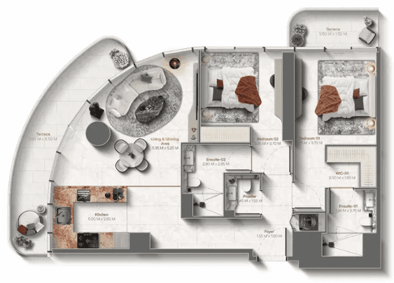 لو شاتو باي بِيوند هو تعبير عصري عن الفخامة مستوحى من الفلسفة الفرنسية فن العيش (L’art de vivre). يقع المشروع ضمن إيفرمور، الوجهة المتكاملة التي تم تطويرها بالكامل من قبل بِيوند في رأس الخيمة، ليكون جزءًا من بيئة ساحلية مُصممة بعناية حيث تتكامل العمارة مع الطبيعة ونمط الحياة في رؤية واحدة متناسقة. يرتفع المشروع بتصميم نحتي حلزوني مميز عبر 31 طابقًا، ويضم 257 وحدة سكنية. يتميز البرج بانسيابية خطوطه، وشرفاته المتناوبة باللونين الأبيض والبرونزي، إلى جانب المساحات الخضراء المدمجة التي تضفي نعومة على الواجهة وتعزز الارتباط بالبحر والسماء. تم تصميم الشقق من غرفة إلى ثلاث غرف نوم لتغمرها الإضاءة الطبيعية، مع توزيع مدروس يحقق توازنًا وانسيابية بين المساحات الداخلية والخارجية. تمثل المرافق والخدمات في لو شاتو امتدادًا طبيعيًا للحياة اليومية، وليست مجرد إضافات منفصلة. حيث تعيد الحدائق المنسقة والساحات المصممة والتراسات المرتفعة تفسير مبادئ الحدائق الفرنسية الكلاسيكية بروح عصرية هادئة. يضم المشروع مسبح إنفينيتي مخصصًا للبالغين مع مناطق جلوس مدمجة، ليكون نقطة استرخاء رئيسية، إلى جانب صالة رياضية متطورة متصلة بمناطق خارجية للرياضة واليوغا، لدعم نمط حياة متوازن. كما يوفر المشروع مناطق مخصصة لتناول الطعام في الهواء الطلق وحفلات الشواء، ومساحات لعب للأطفال، وقاعة فعاليات، وخدمات كونسيرج، ومكتبة، لتشكيل أسلوب حياة متكامل قائم على الراحة والتواصل والاستمتاع اليومي. أما التصميمات الداخلية، فتعتمد على الضوء والتوازن والأناقة الهادئة. تمتد المساحات المعيشية عبر نوافذ ممتدة من الأرض إلى السقف وشرفات واسعة تعزز الشعور بالانفتاح والاتصال بالطبيعة. وتأتي المطابخ بتصميم أنيق بمواد راقية وألوان محايدة وتفاصيل دقيقة تجمع بين الوظيفة والجمال. بينما تتميز غرف النوم بالاتساع والهدوء في اختيار المواد، وتُستكمل الحمامات بتشطيبات دافئة وإضاءة ناعمة، لتقديم بيئة معيشية راقية ومتوازنة تعكس جودة التصميم ودقته.