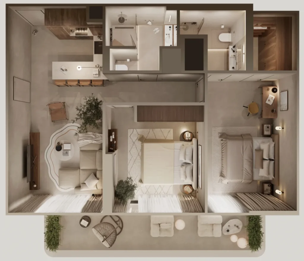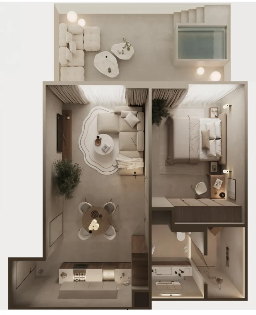 - استوديو بغرفتين نوم