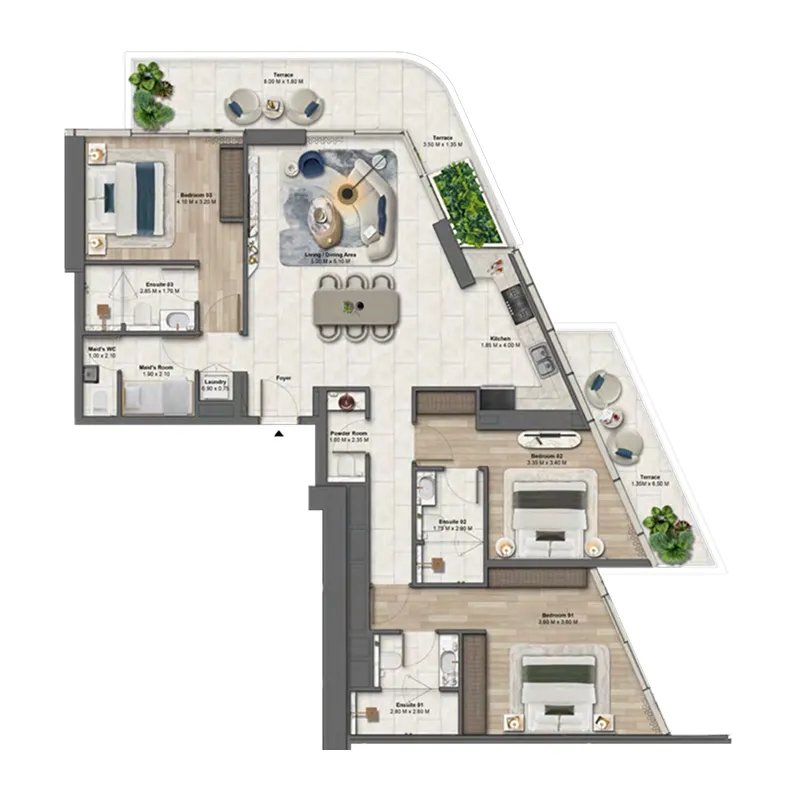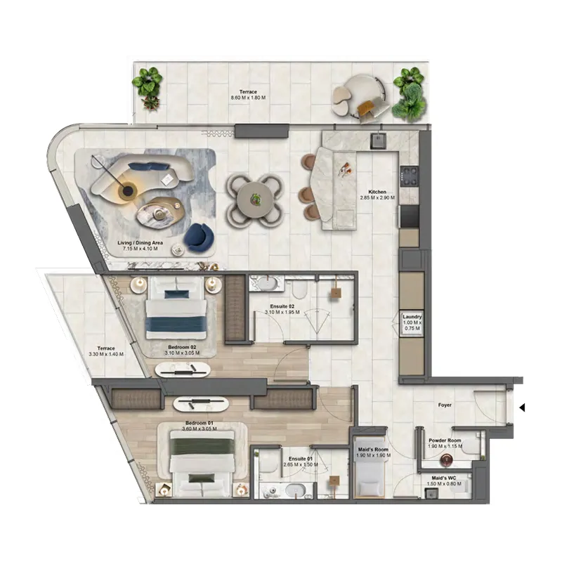 يمثل سولفير باي بيوند بصمة معمارية بارزة ترتفع في قلب مدينة دبي البحرية، حيث يلتقي هدوء الواجهة البحرية بإيقاع المدينة النابض. يتألف المشروع من برجين نحتيين بارتفاع 44 و31 طابقًا، ليعيد تعريف مفهوم السكن الفاخر على الواجهة البحرية من خلال الشرفات المضيئة، والإطلالات البانورامية على الخليج العربي وأفق المدينة، والخطوط المعمارية الراقية. كل مساحة فيه صُممت لالتقاط الضوء الطبيعي ونسيم البحر وشعور الاتصال الأزلي بين السماء والشاطئ. بمزجه بين الأناقة والحيوية، يوفّر سولفير ملاذًا للمقيمين تحيط به الطبيعة، بينما يبعد دقائق فقط عن أهم المعالم الثقافية والتجارية في دبي. ترتكز فلسفة التصميم في المشروع على دمج هدوء الطبيعة مع رقي الحياة العصرية — حيث تضفي المناظر الطبيعية الغنّاء وحدائق البوديوم والشرفات المتدرجة تدفقًا عضويًا بين المساحات الداخلية والخارجية. وسط هذا التناغم، يستمتع السكان بالسكينة وسهولة الوصول في آن واحد، مع مواقع مثل ذا كوف، ذا فوريست، والخليج العربي على بُعد خطوات. تعكس التصاميم الداخلية لسولفير جماليات العيش الراقي — لوحات لونية حيادية ناعمة، مساحات مفتوحة، وتشطيبات حجرية طبيعية. وتضم المجموعة المختارة من الوحدات شققًا بغرفة إلى ثلاث غرف نوم، وشاليهات على البوديوم، ودوبلكسات، وبنتهاوسات، كل منها يتميز بتفاصيل مصممة بعناية وشرفات خاصة. تأتي المطابخ بخزائن أنيقة، وأسسطح حجرية، وأجهزة مدمجة، بينما تشمل المرافق مسابح إنفينيتي، واستوديو لياقة بدنية، وسينما، ومكتبة، وصالة عافية، وناديًا للمقيمين، وحديقة على البوديوم. يحوّل مشروع سولفير كل لحظة إلى تجربة راقية، جامعًا بين الفن المعماري وروح الحياة المجتمعية.