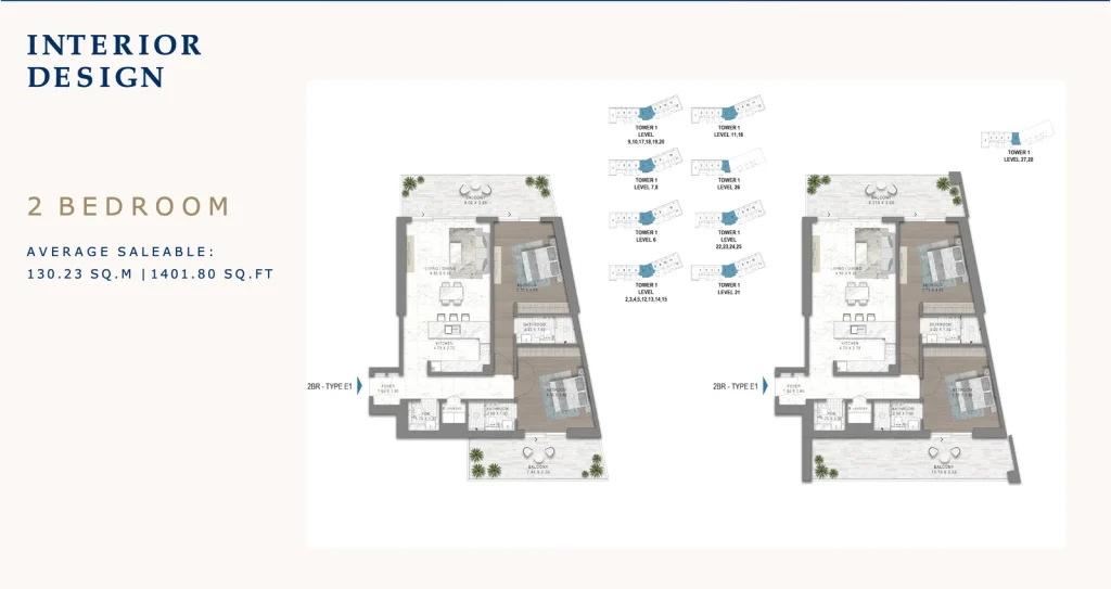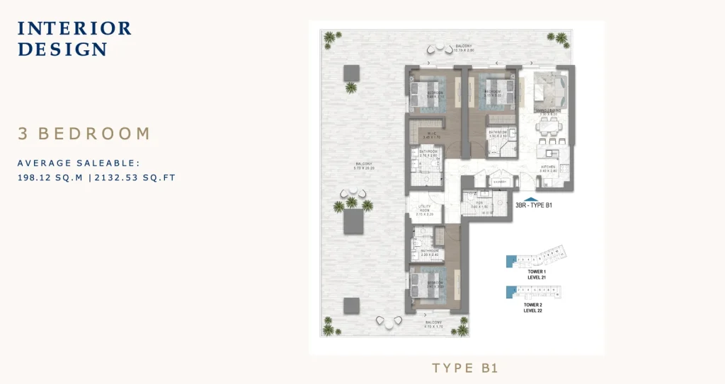 Chelsea Residences is developed as two master-planned clusters (Chelsea 1 & 2), each comprising three towers with G+2P+25โ33 floors. The community is tailored for young professionals and health-conscious residents, offering wellness retreats, smart home automation, branded social spaces, and cutting-edge design. Apartment interiors include built-in wardrobes, porcelain flooring, fitted kitchens with premium appliances, and balconies with sea or marina views.