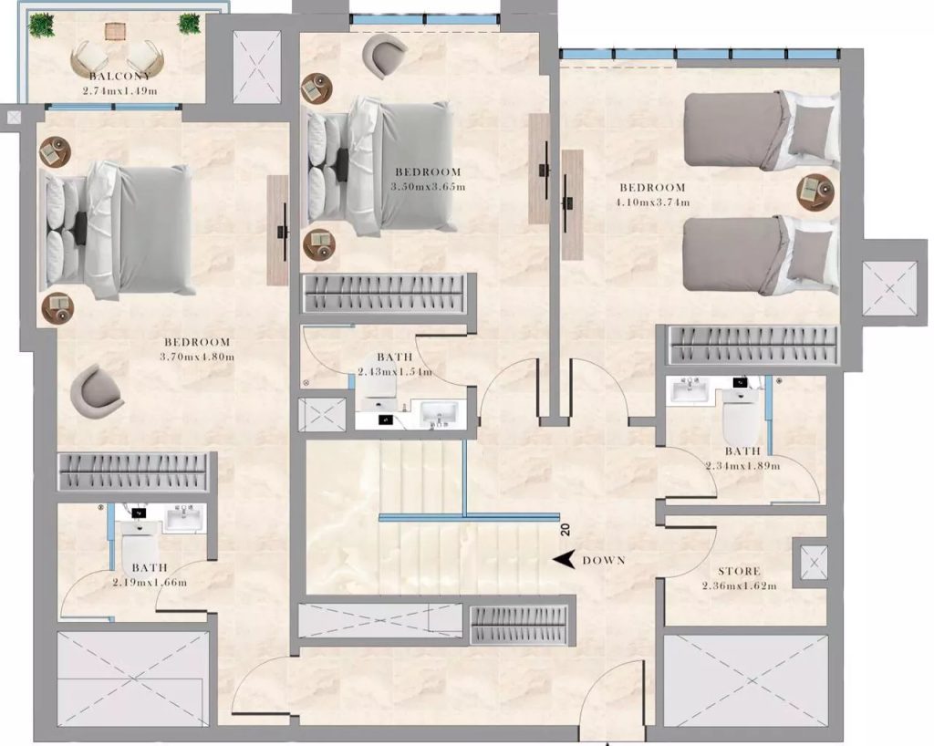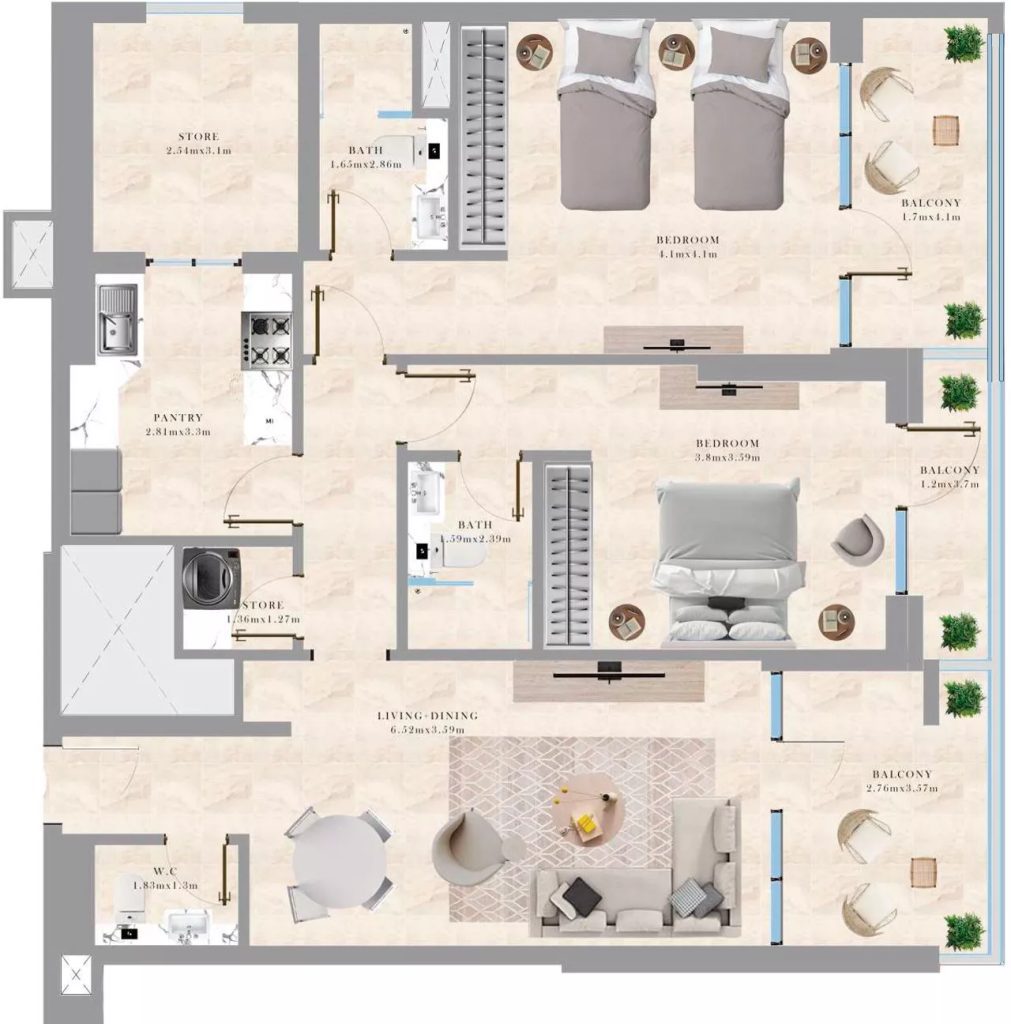 The residences have functional layouts and stunning views of the city, including Dubai Marina and Burj Al Arab. Property sizes range from 696 sq. ft to 2,199 sq. ft. Residents will appreciate the built-in wardrobes, closed-type kitchens and storage spaces.