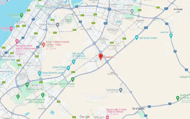 Dubailand with road connectivity to major Dubai highways (exact routes not confirmed).
