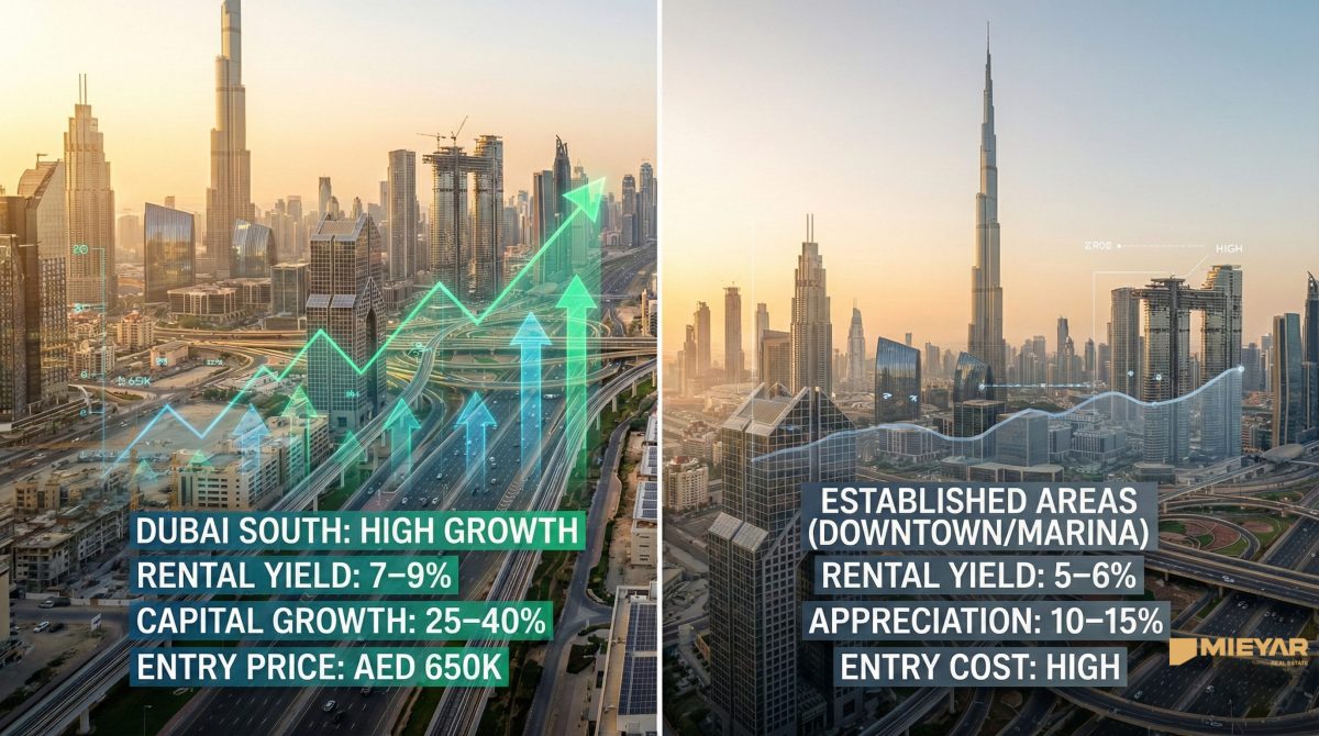 | Metric | Dubai South (2026 Est.) | Established Areas (Marina/Downtown) |